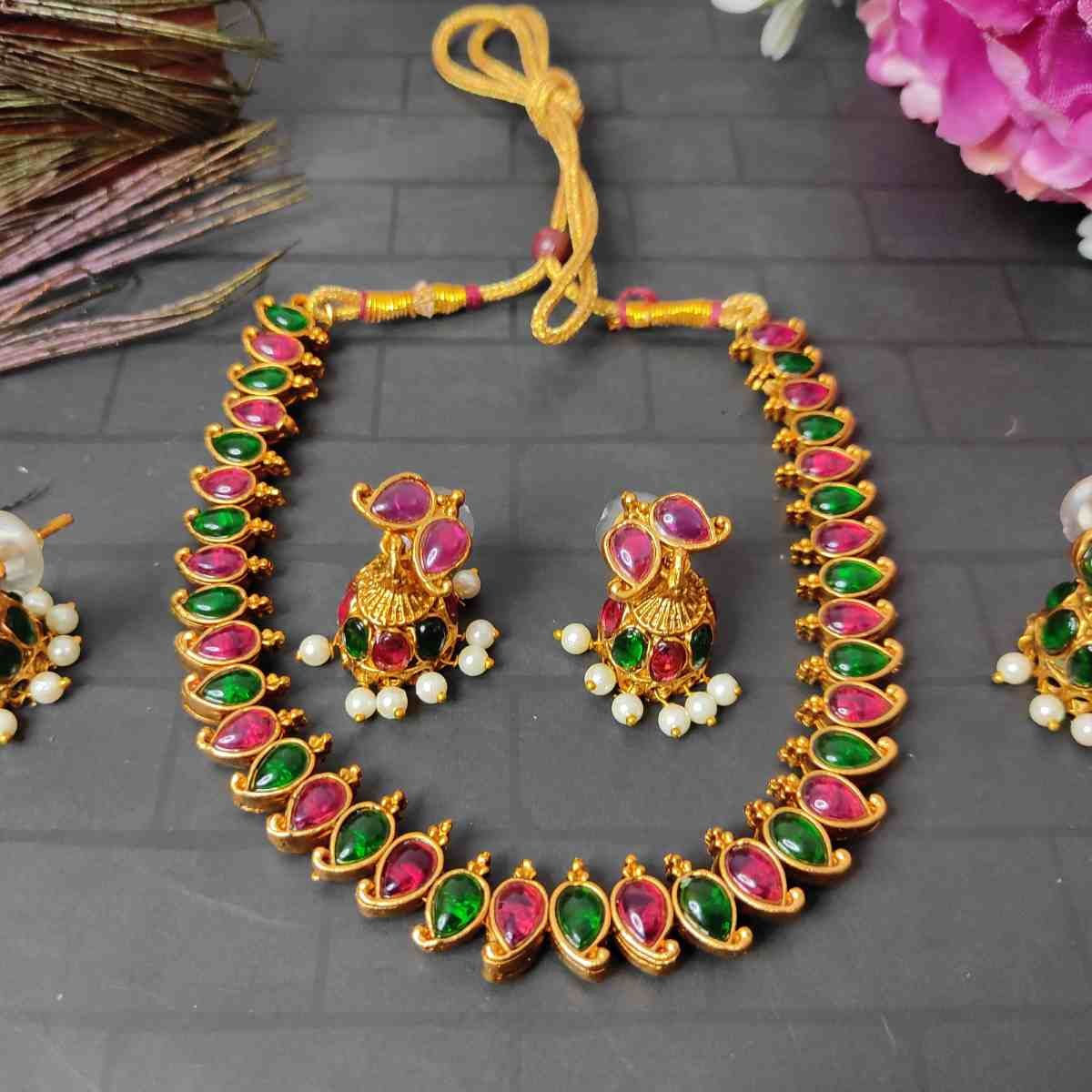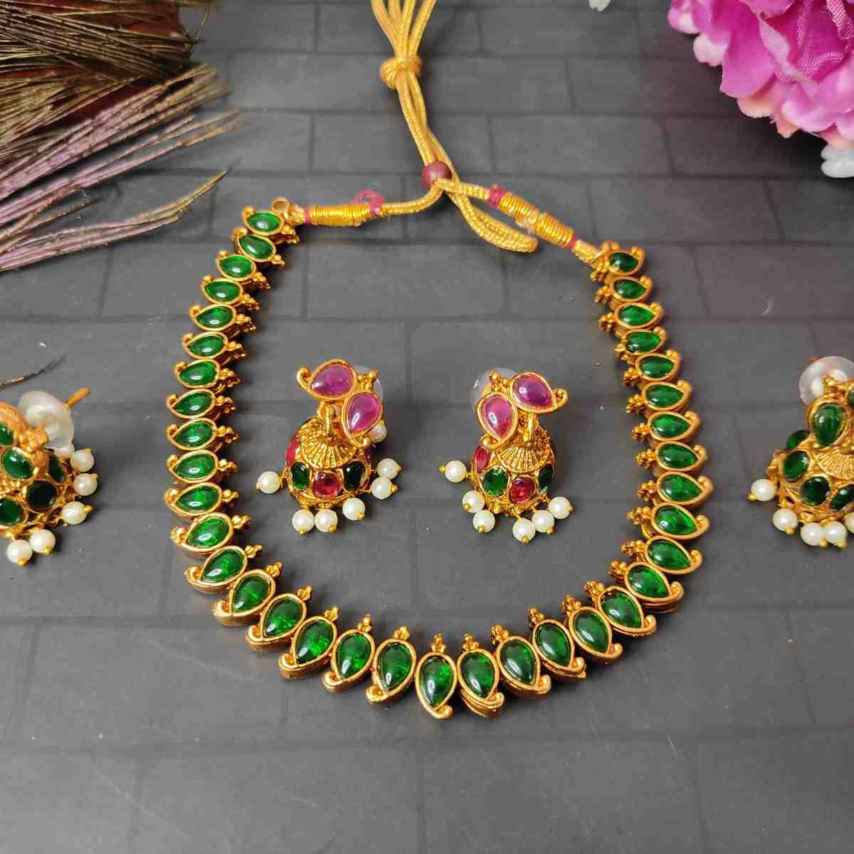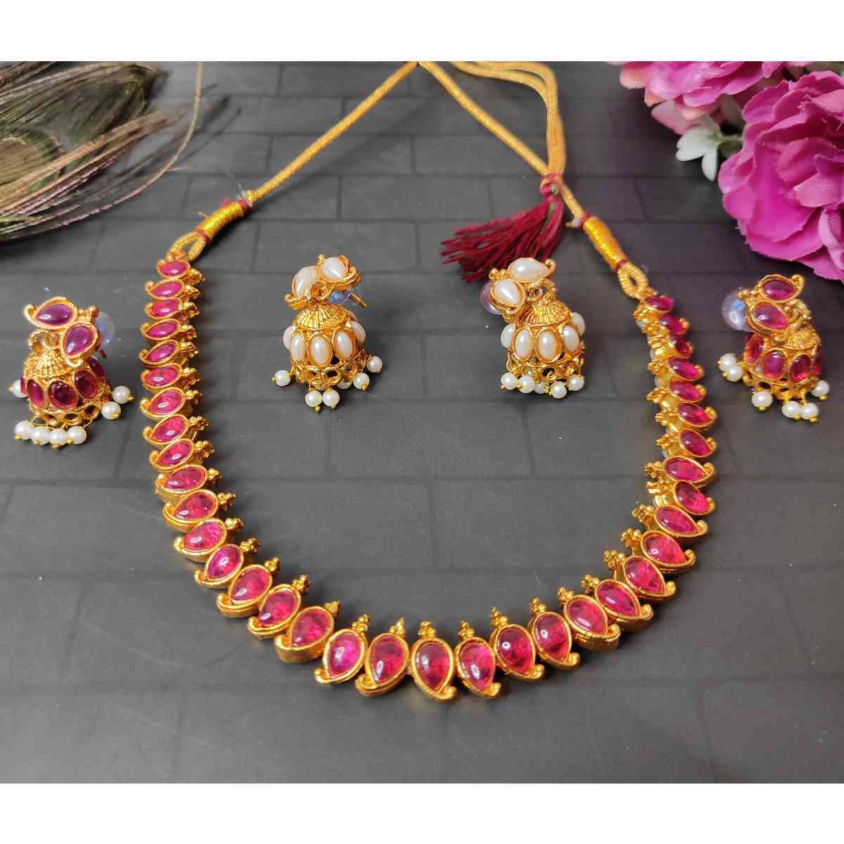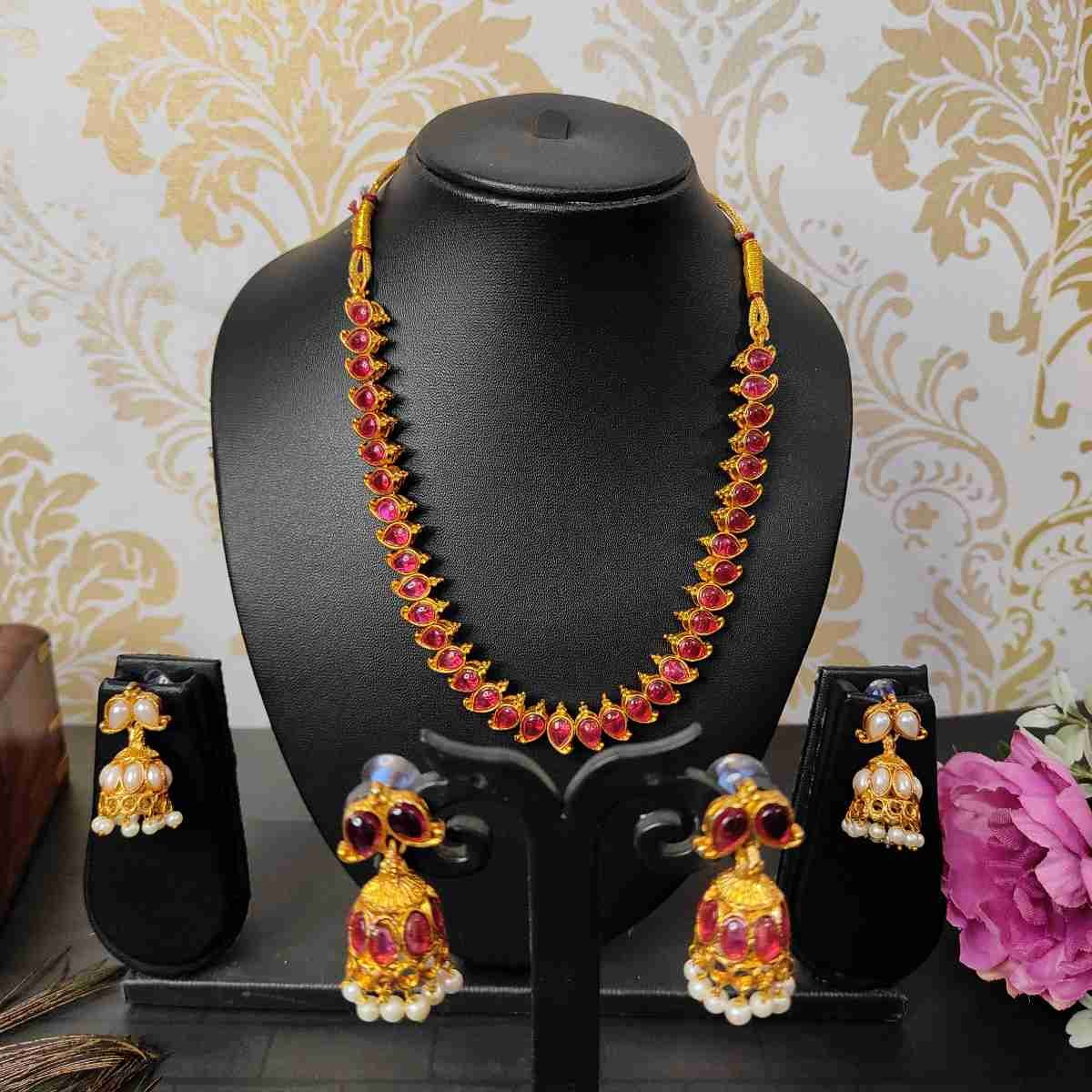 2in1 Ruby, Green Stone with Pearls Reversible Necklace with 2 Jhumka Earrings