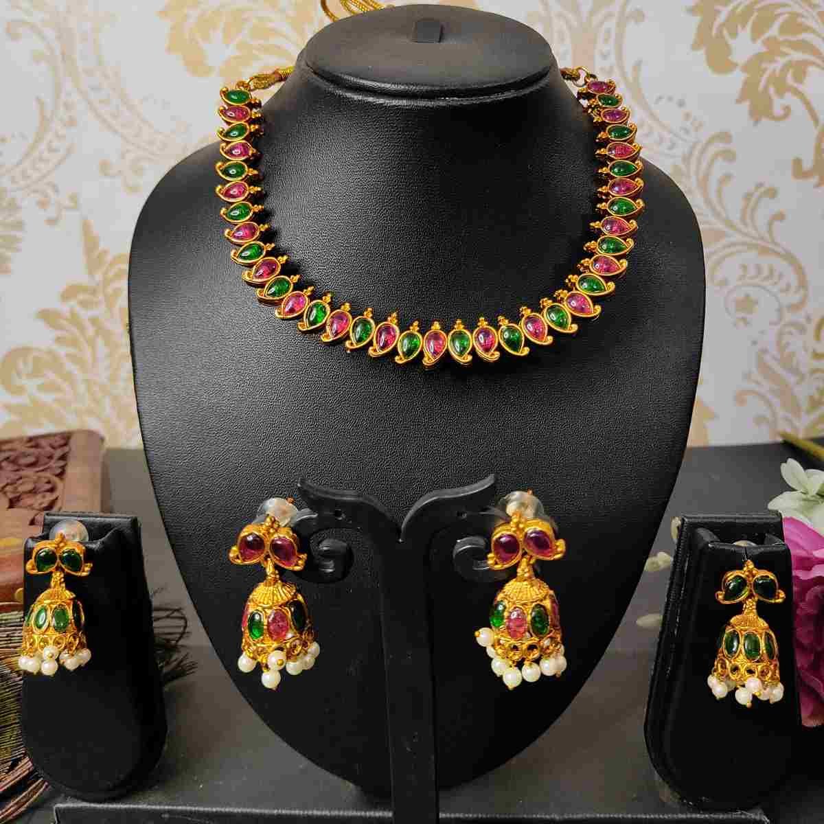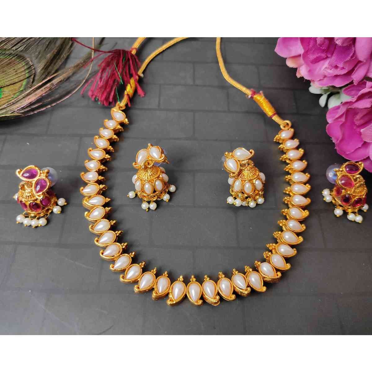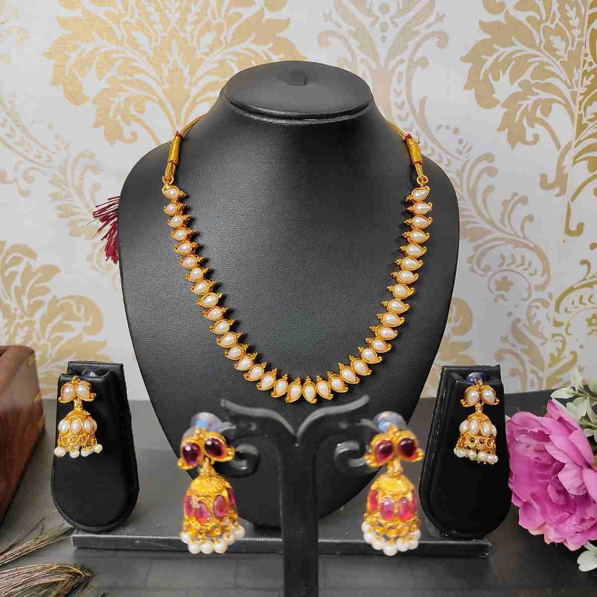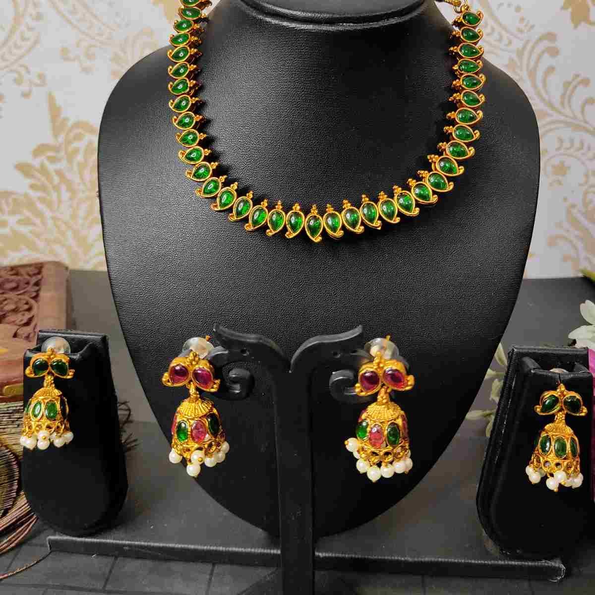 2in1 Ruby, Green Stone with Pearls Reversible Necklace with 2 Jhumka Earrings