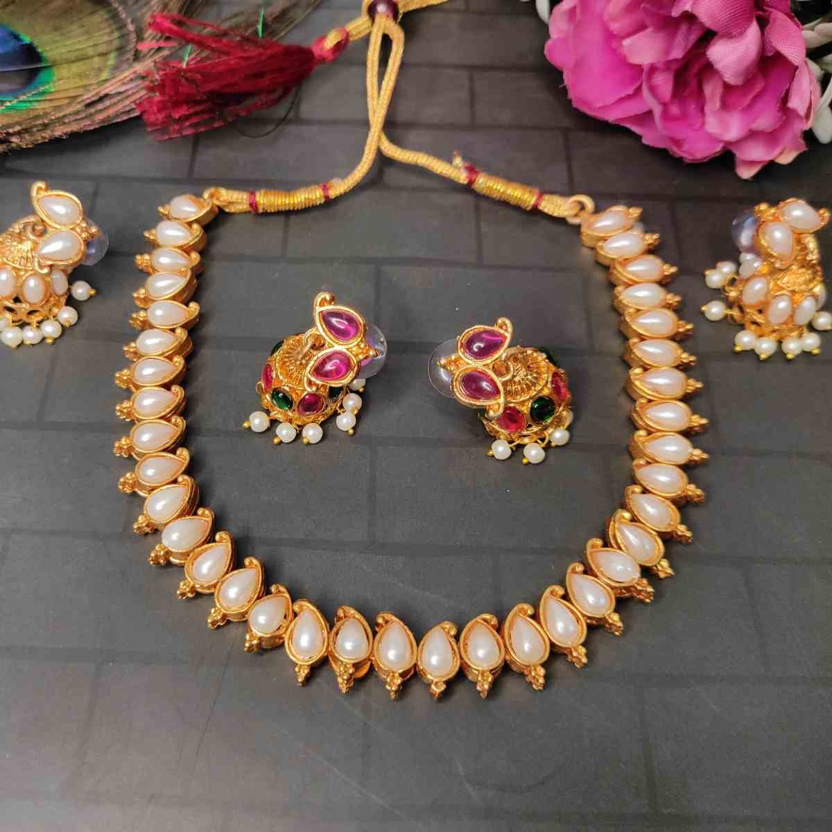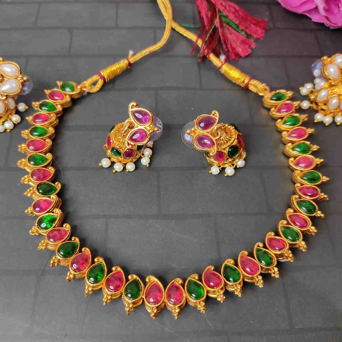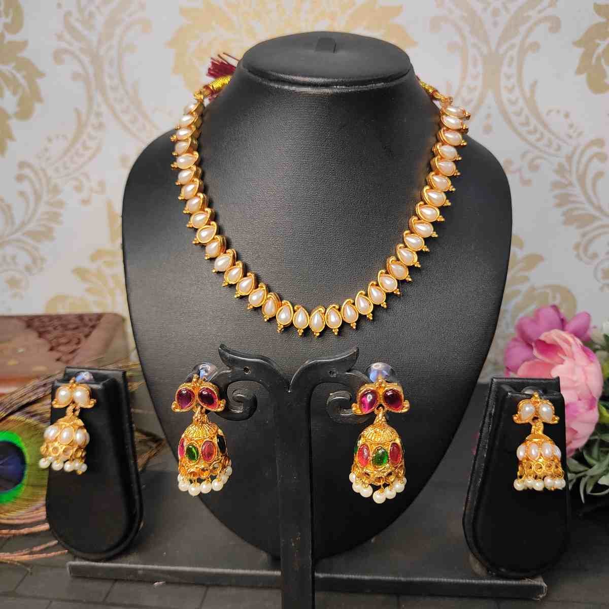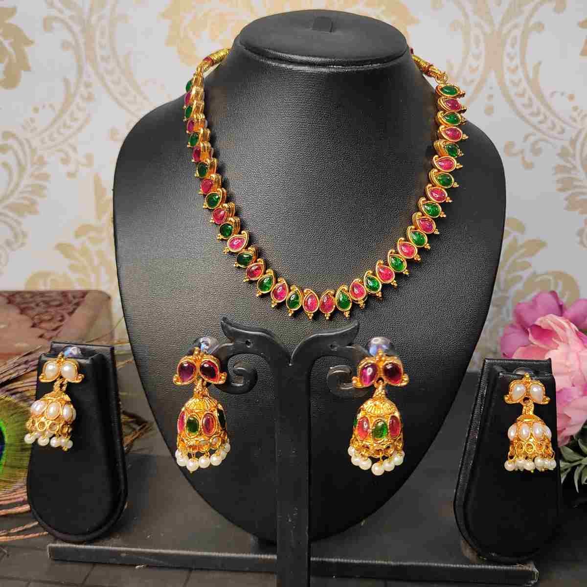 2in1 Ruby, Green Stone with Pearls Reversible Necklace with 2 Jhumka Earrings