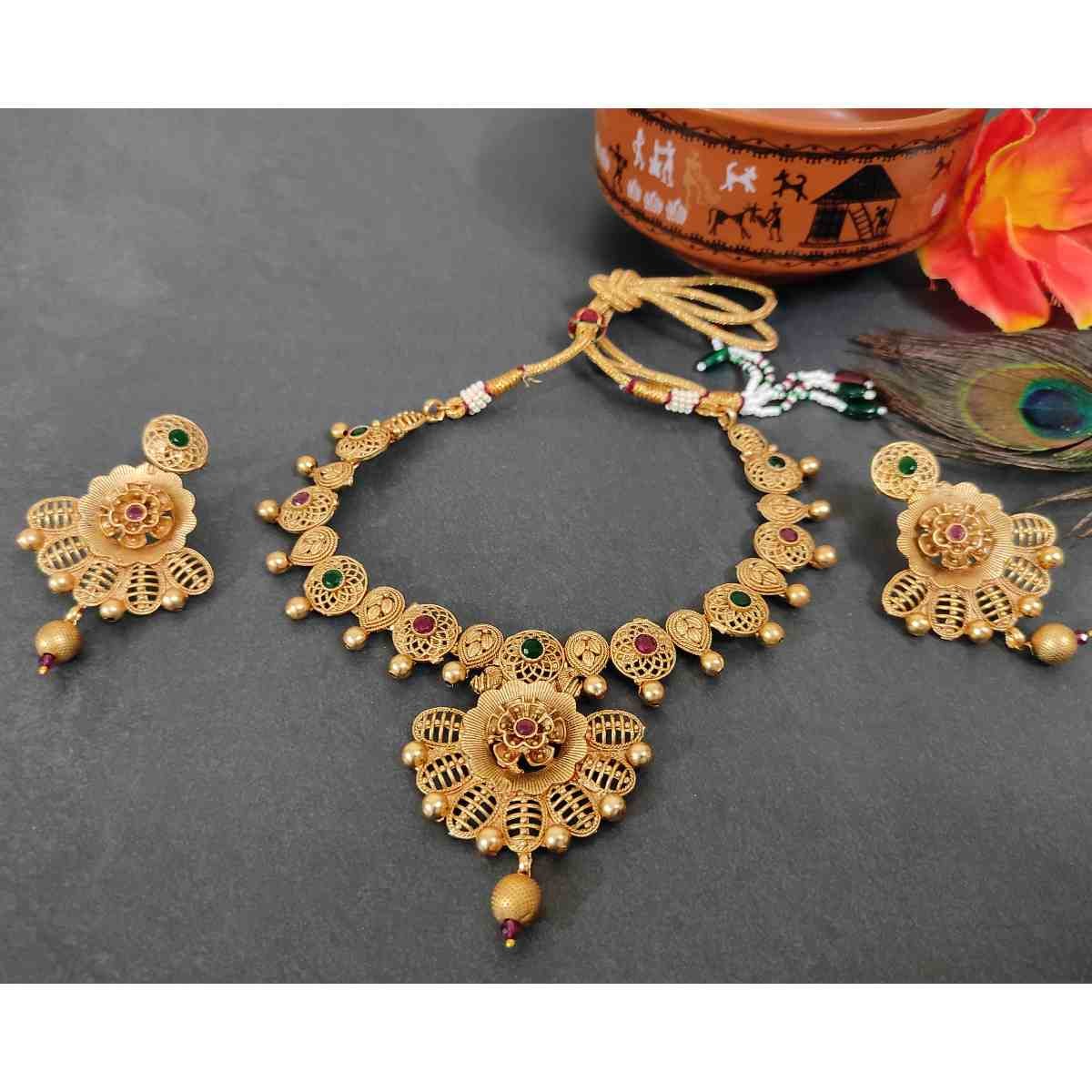 Flower and Leaf Design with Maroon , Grren Stone & Golden Ball Rajwadi Necklace and Earring Set