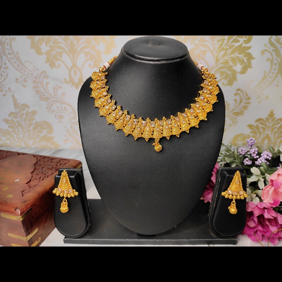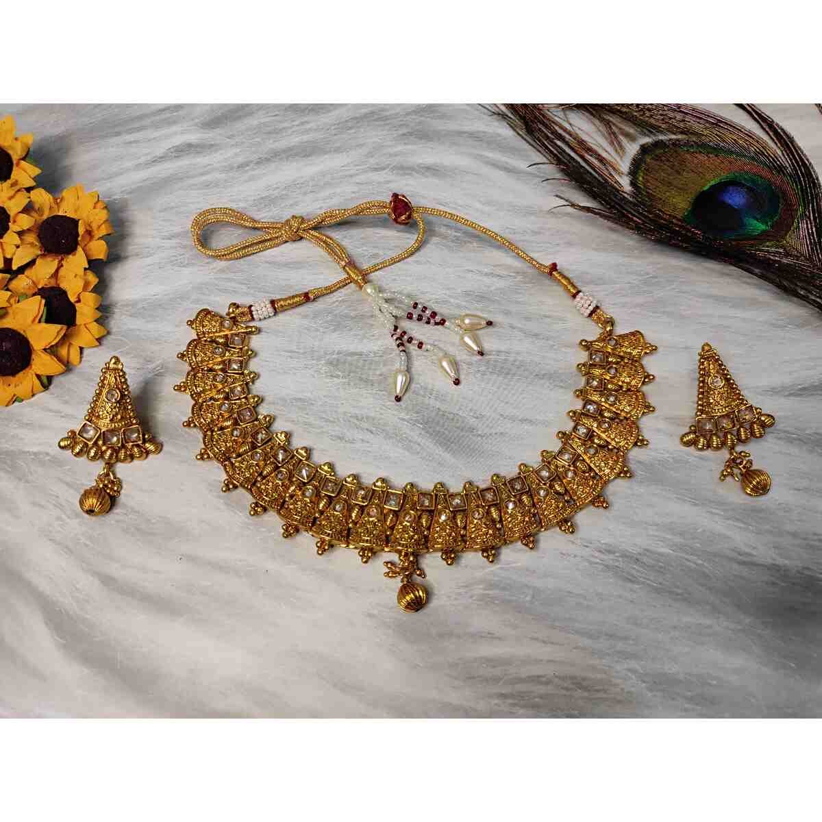 Gold Plated Kundan Temple Choker Necklace and Antique Earring Jewellery Set