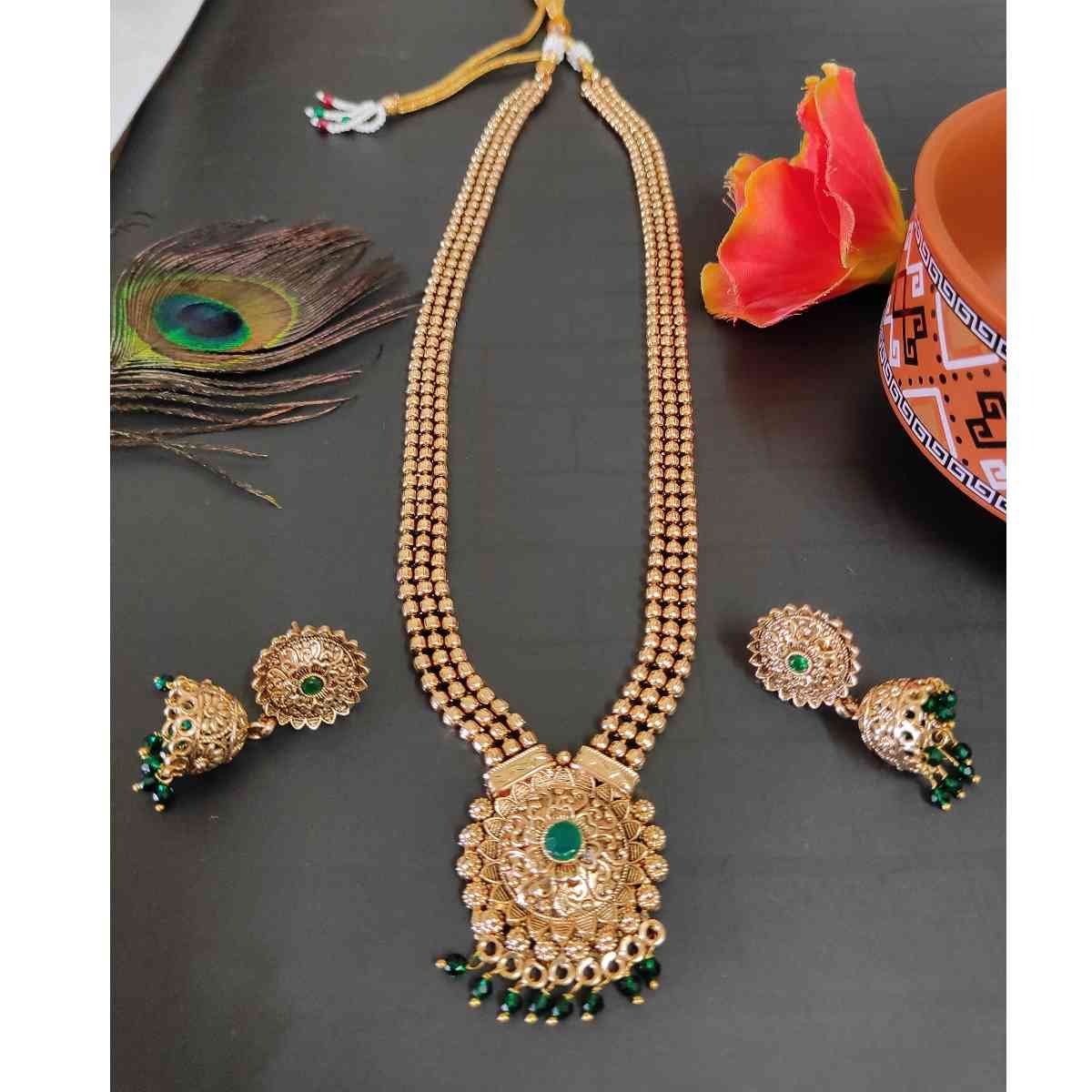 Green Stone High Quality Gold Matte Finish Long Necklace Jhumka Earring Set