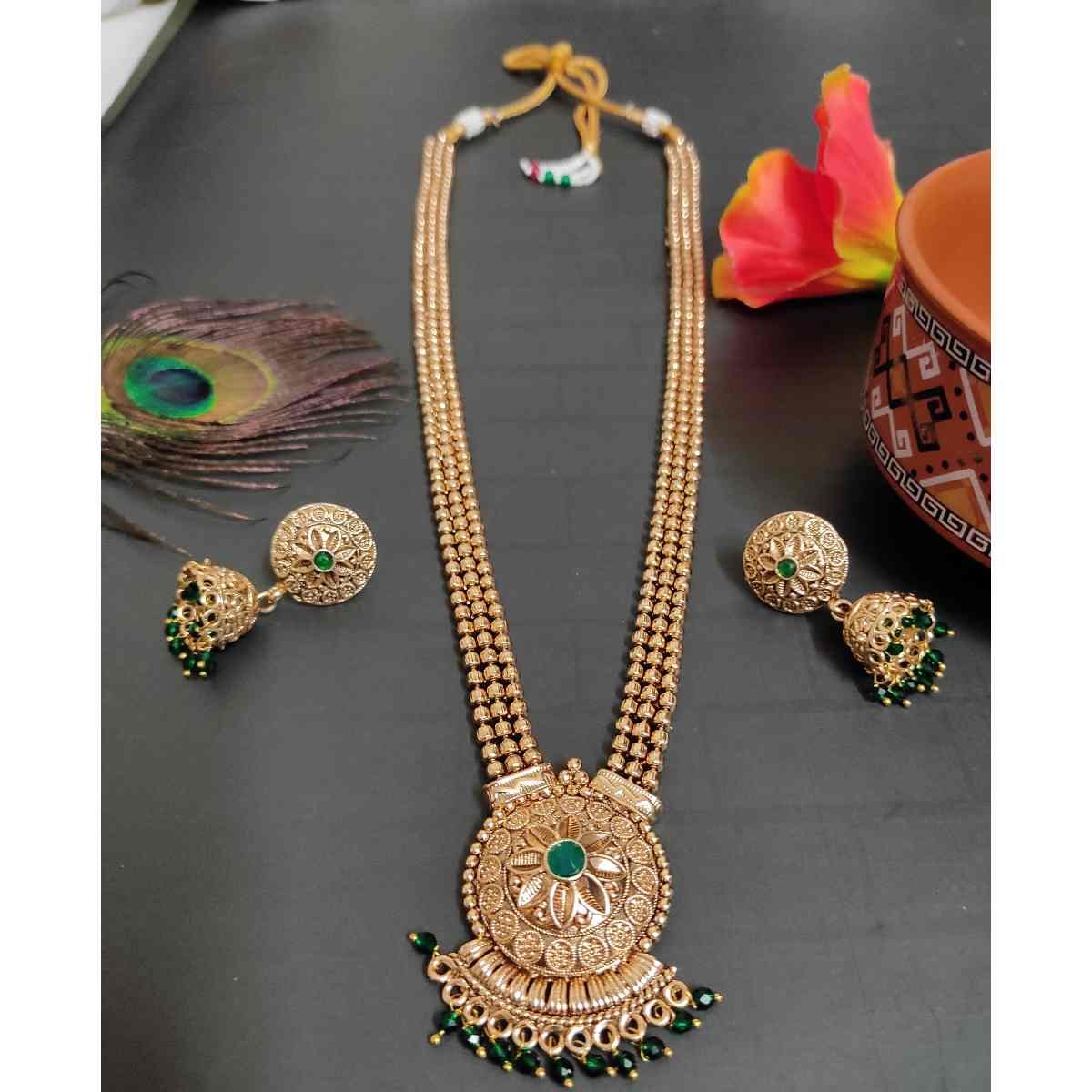 High Quality Gold Plated Green Stone Long Haram and Jhumka Earring Necklace set