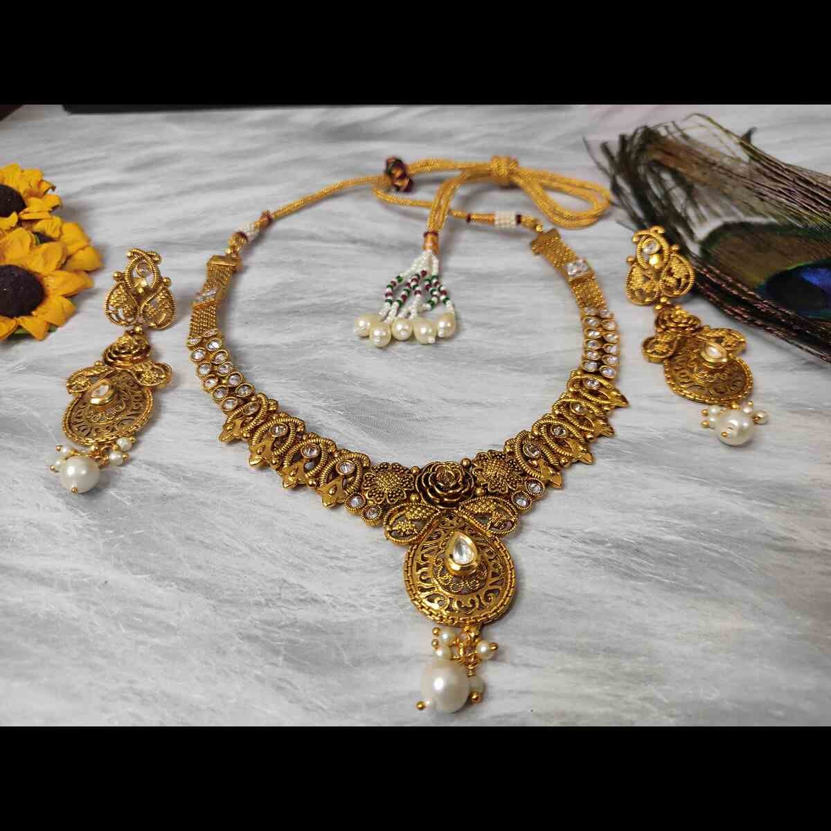 Be the first to review “Latest Trendy Kundan Pearl Gold Plated Necklace and Dangle Earring Jewellery Set”