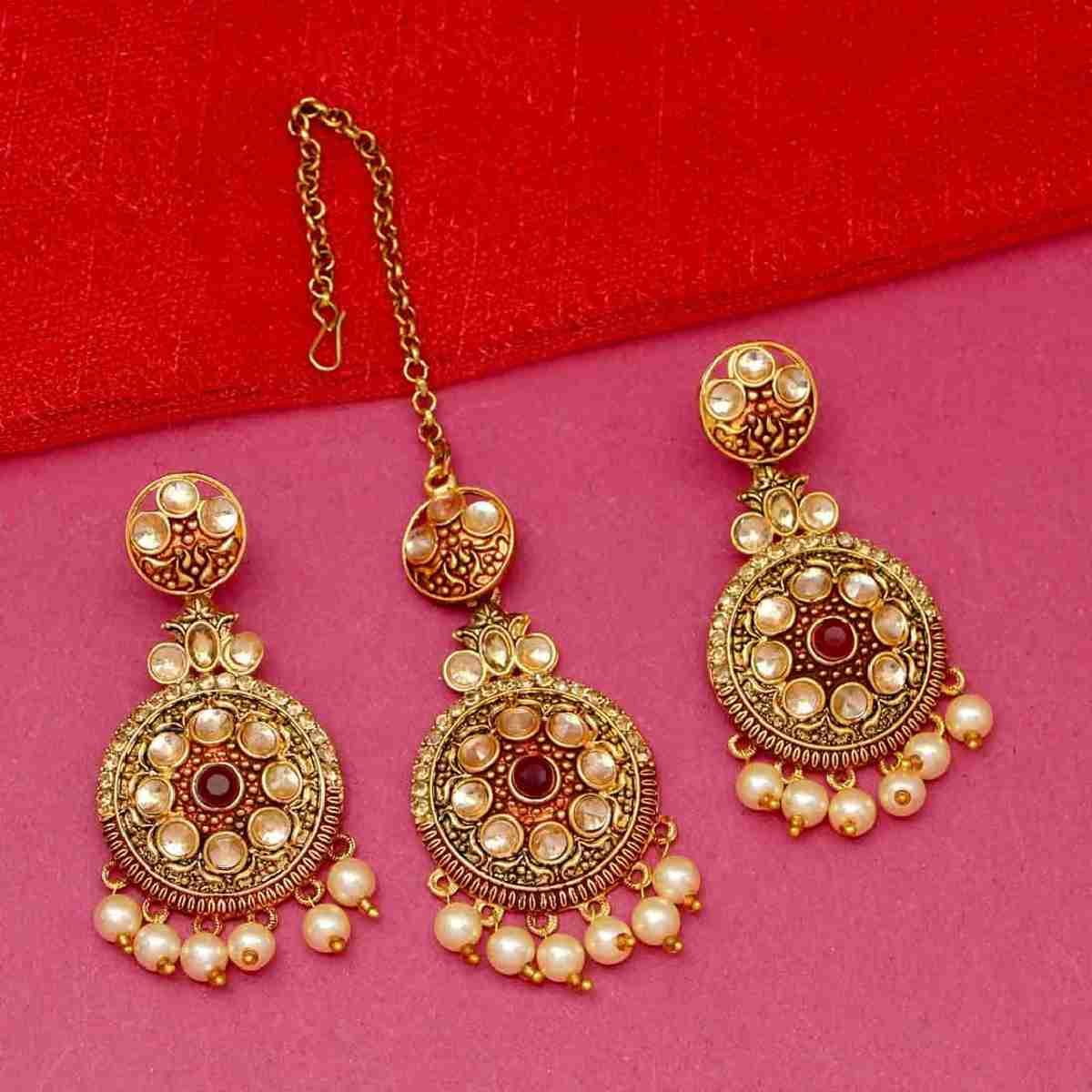 Maroon & White Kundan Pearl Earring and Maang tikka Set