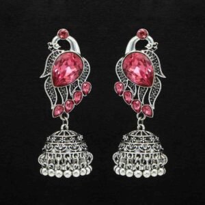 Peacock Design Pink Crystal Stone Oxidised Earring