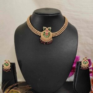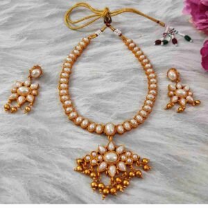 Unique Temple Design Pearl Matte Finish Necklace and Earring Set