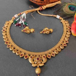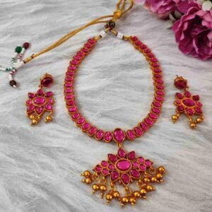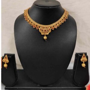 Unique Temple Design Ruby Stone Golden Balls Matte Finish Necklace and Earring Set