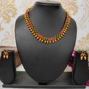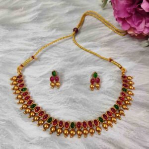 Unique Temple Design Ruby & Green Stone Golden Balls Matte Finish Necklace and Stud Earring Set