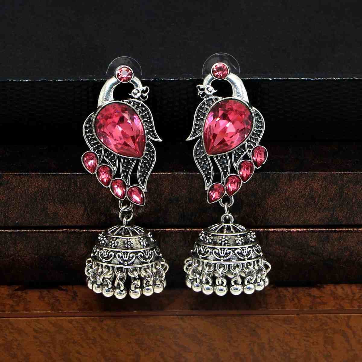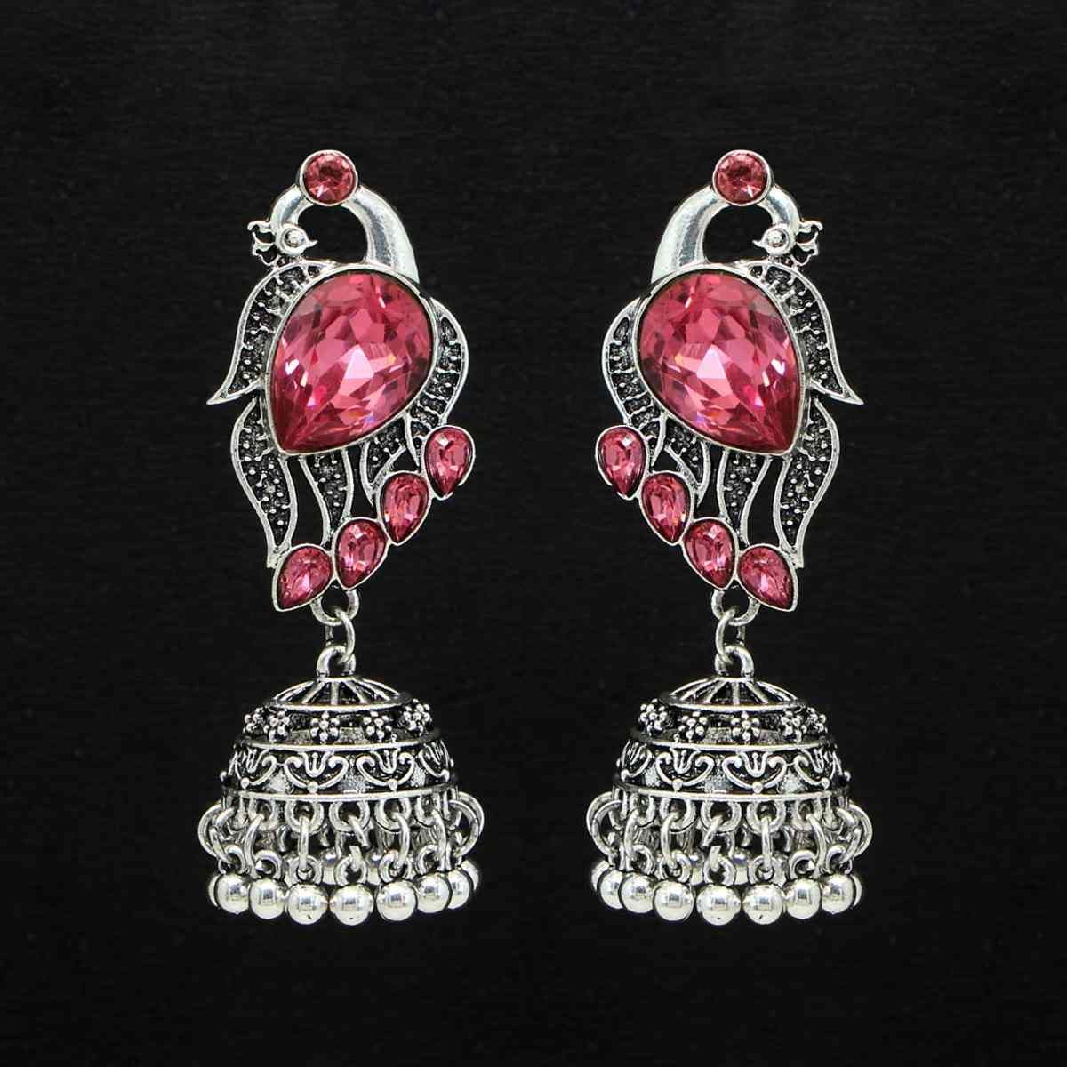 Peacock Design Pink Crystal Stone Oxidised Earring