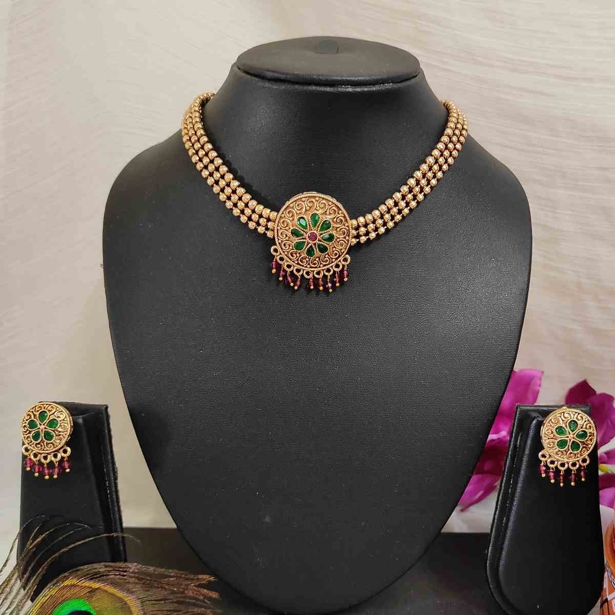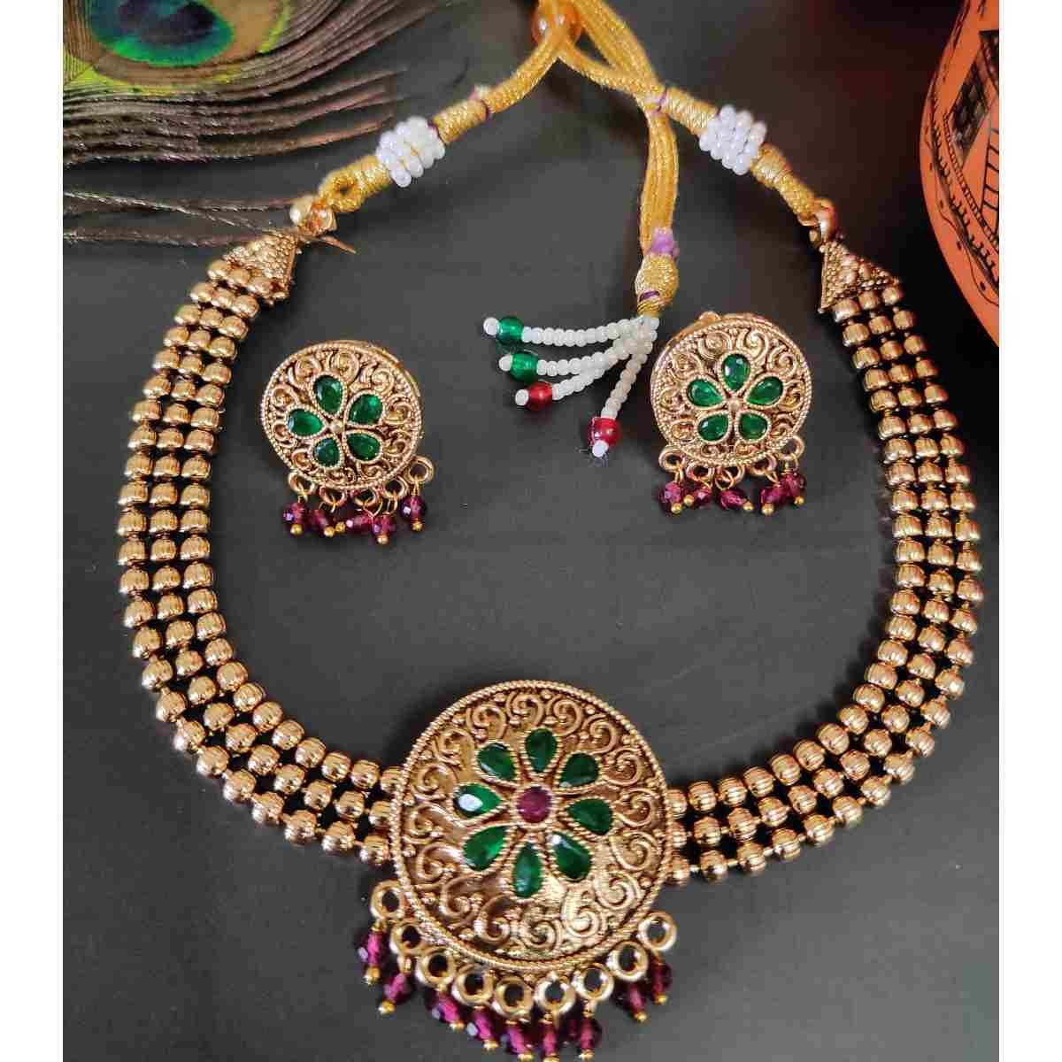 Ruby & Green Stone High Quality Gold Matte Finish Choker Necklace Earring Set