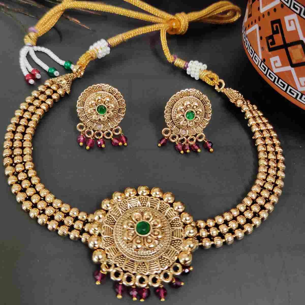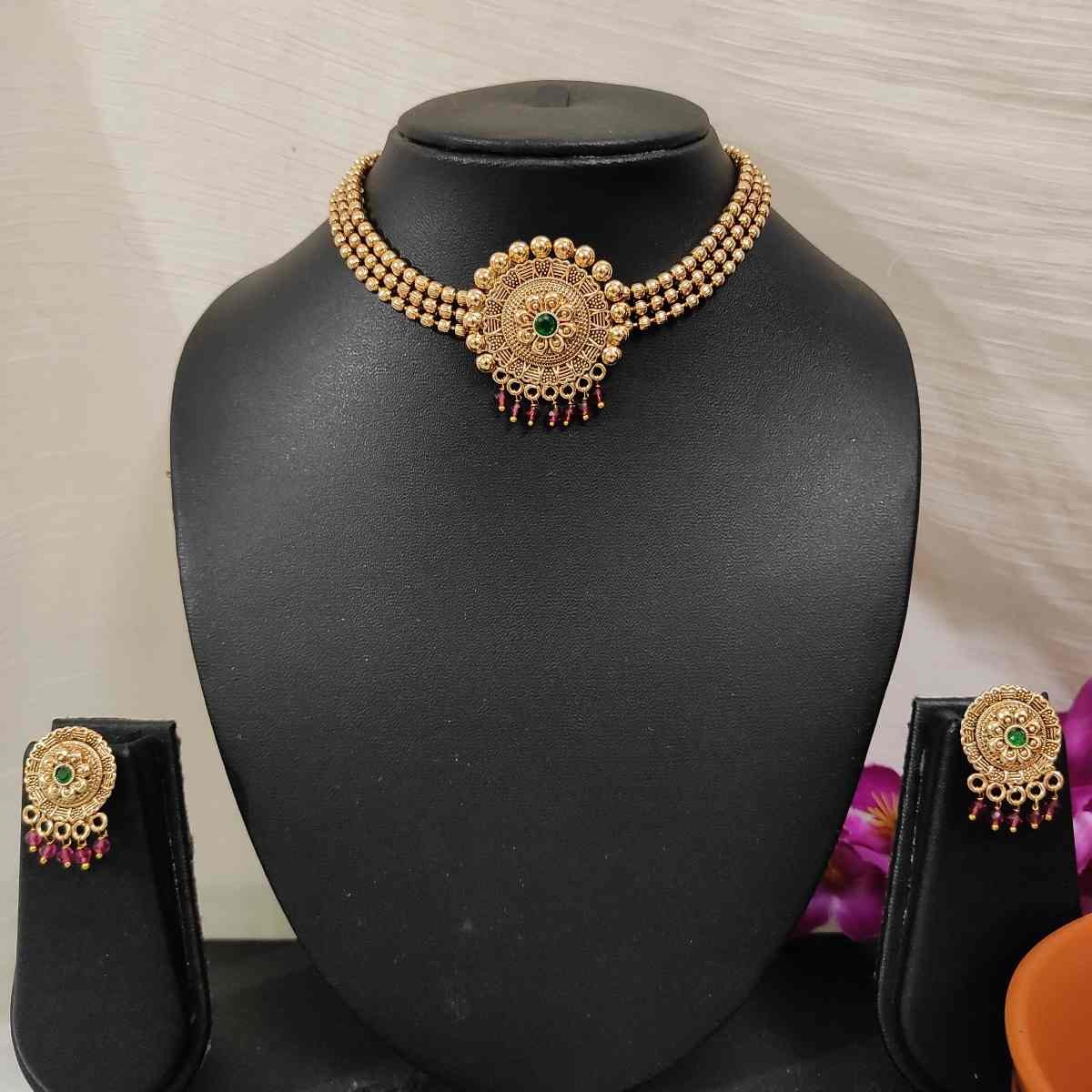 Ruby & Green Stone High Quality Gold Matte Finish Choker Necklace Earring Set