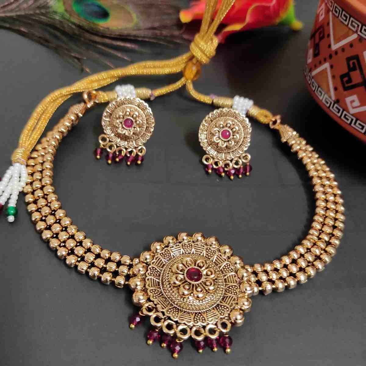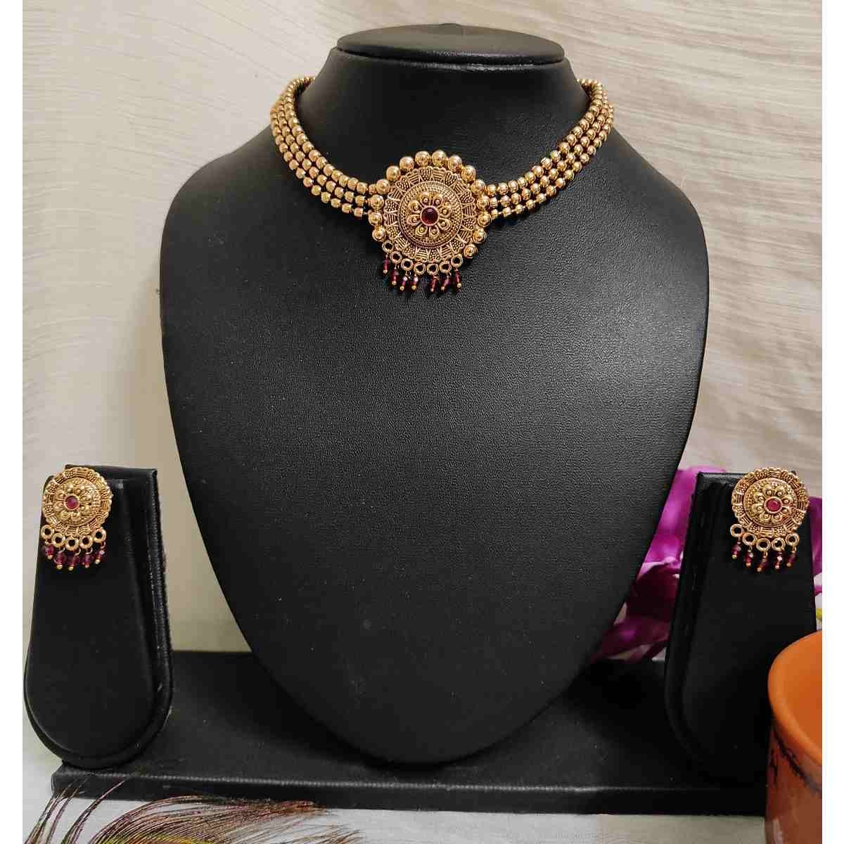 Ruby Stone High Quality Gold Matte Finish Choker Necklace Earring Set