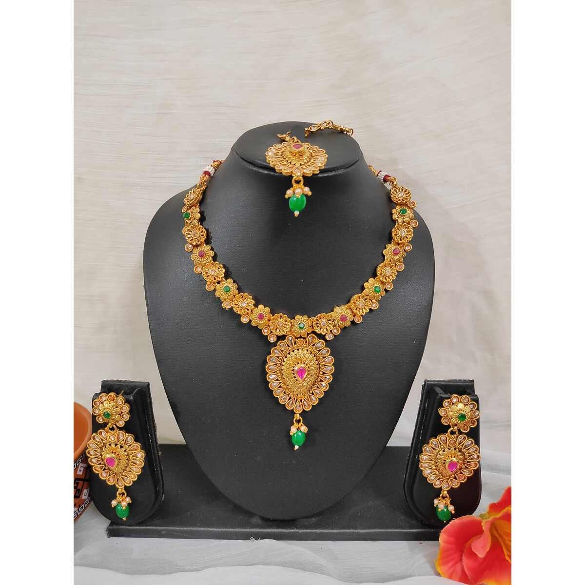Be the first to review “Traditional South Indian Copper Highly Gold Plated Necklace Earrings Maangtika Set for Wedding And Party Wear for Women & Girls.” Cancel reply