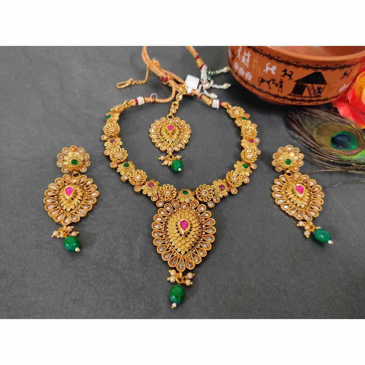 Traditional South Indian Copper Highly Gold Plated Necklace Earrings Maangtika Set for Wedding And Party Wear for Women & Girls.