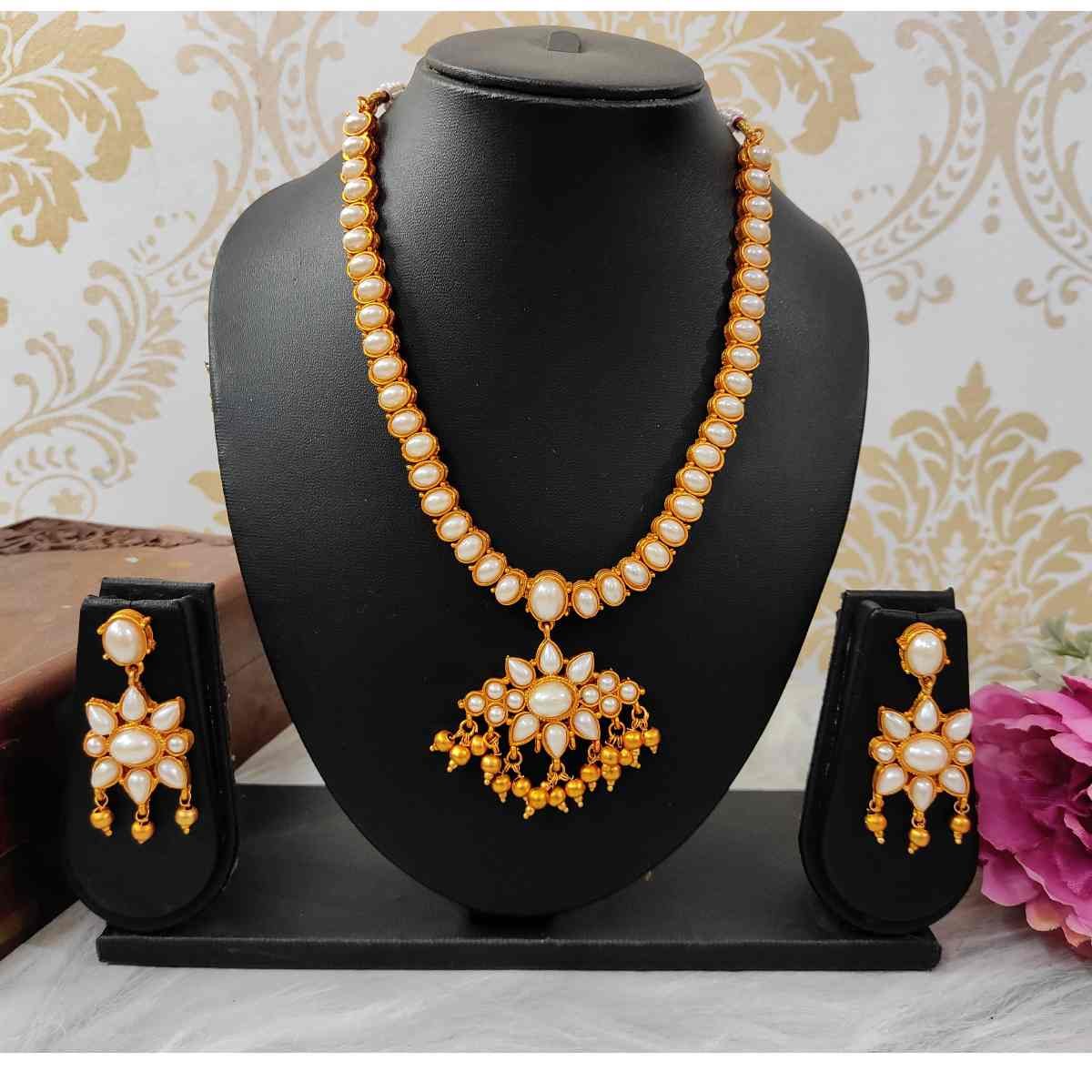 Unique Temple Design Pearl Matte Finish Necklace and Earring Set